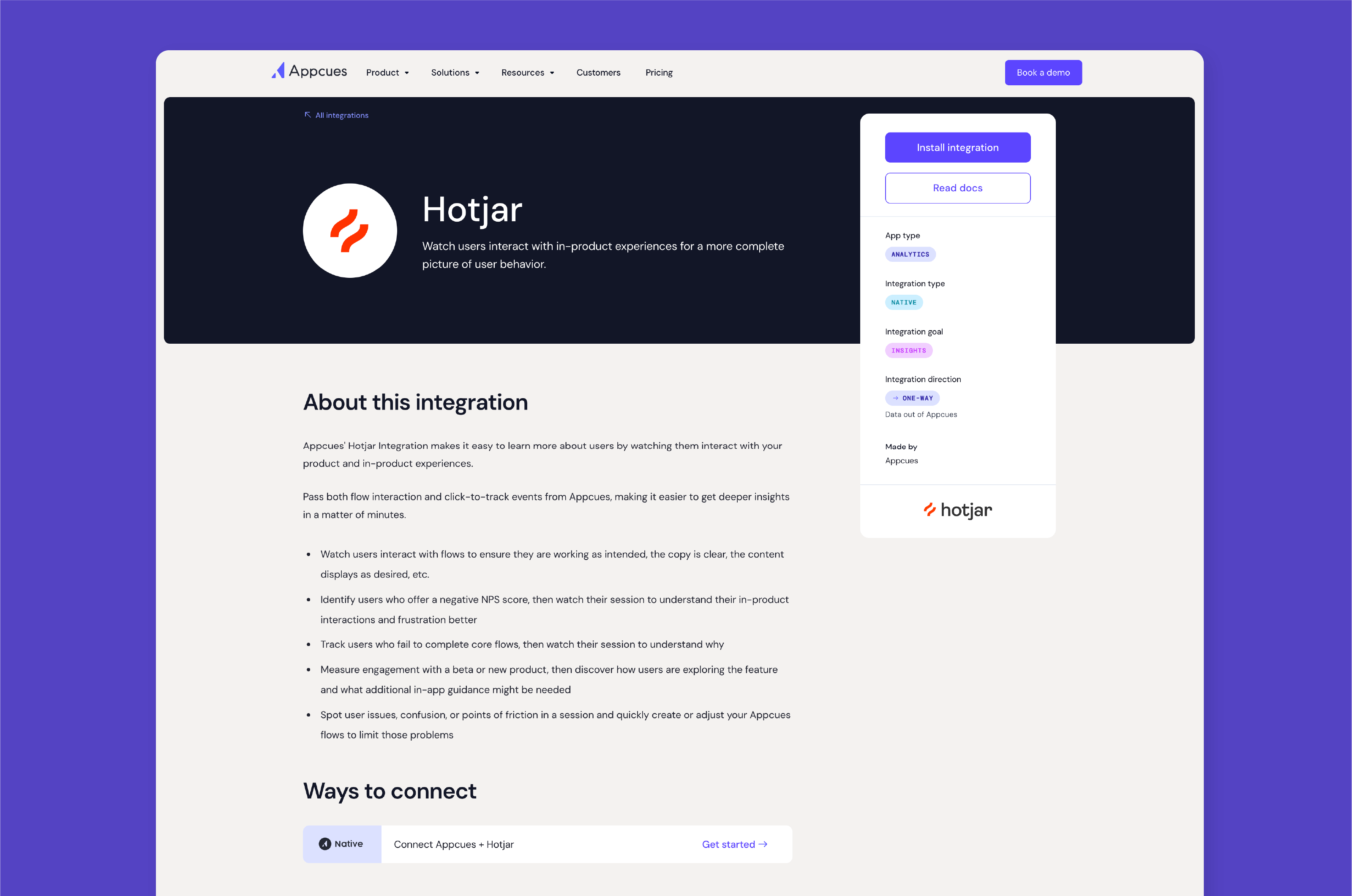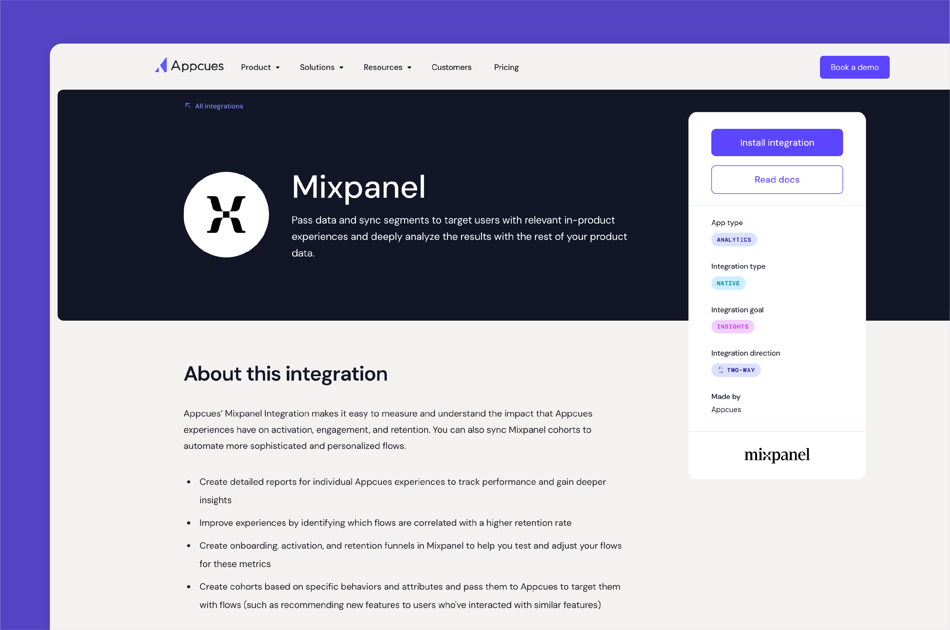 Integration usage turned out to be one of the strongest indicators of customer retention at Appcues, which meant helping customers actually discover and understand our integration library wasn't just a nice-to-have. We had a massive library of one-way and two-way integrations, plus a growing workflows library, and no great way to show people everything they could do with them.
