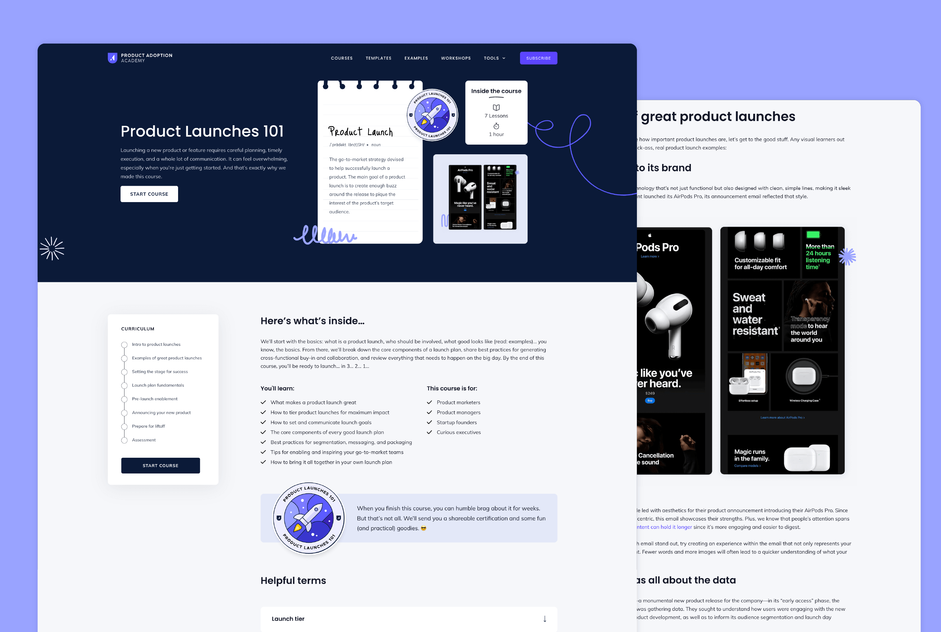 I led the end-to-end creation of the Product Adoption Academy, an education platform designed to help practitioners master product-led adoption. I designed the sub-brand, built the website, set up the certification system, and designed the course experience, including the visuals, layouts, and template frameworks that support the program.
